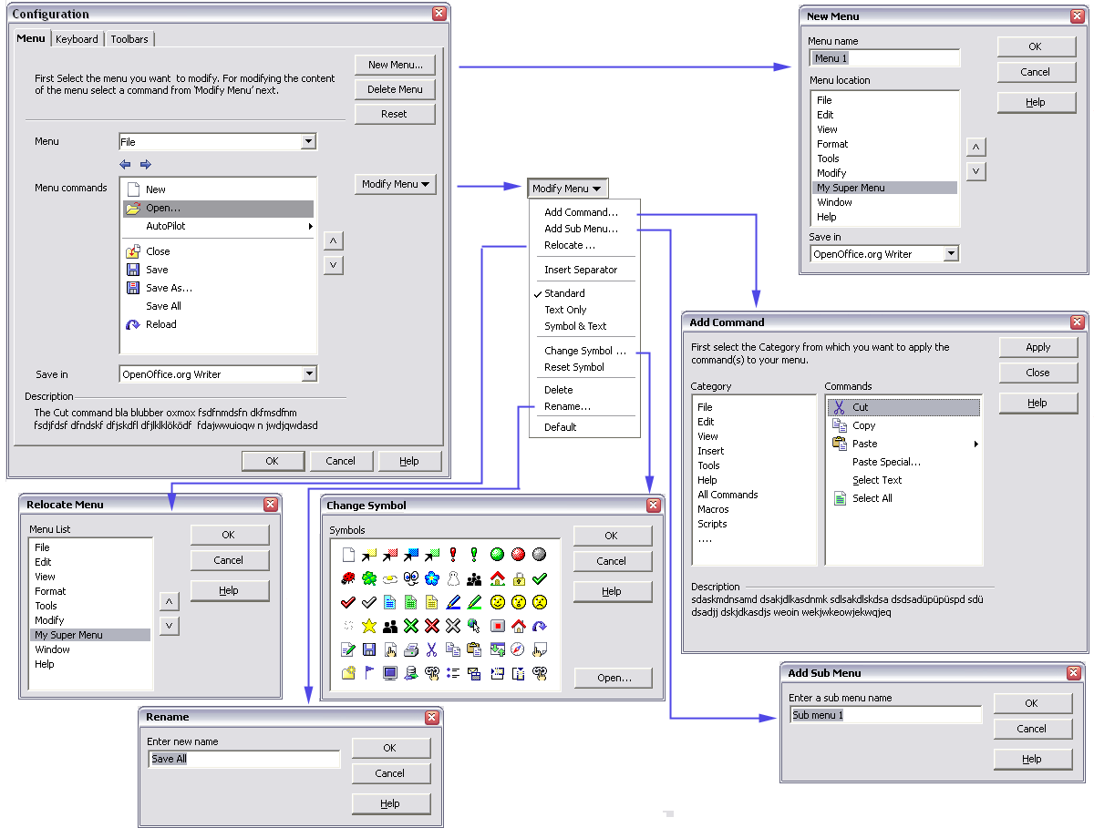 Workflow DescriptionIn this version of the dialog, the action of organising menus is separated from the action of choosing commands in an attempt to simplify the Menu tab.The Menu combo box and Menu commands list are in the main Menu tab and work as described in Mockup A. An extra Add Command... option is added to the Modify Menu... combo button which brings up a seperate Add Command dialog with the Category and Commands lists. |